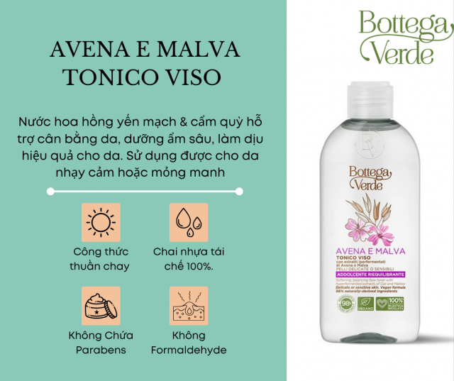 Thương hiệu và Bảo hànhThương hiệu: Bottega VerdeMã sản phẩm: Avena & Malva TonicoNơi sản xuất: ÝThời gian bảo hành: 24 tháng (tùy theo nhà phân phối).Thông tin sản phẩmNước hoa hồng Avena & Malva BOTTEGA VERDE (Ý) 200ml là “bình nước thần” dịu nhẹ từ yến mạch và cẩm quỳ hữu cơ, mang đến làn da sạch – cân bằng – rạng rỡ chỉ trong 10 giây. Với 98% thành phần tự nhiên, không cồn, không paraben, sản phẩm nhẹ nhàng loại bỏ tạp chất còn sót, se khít lỗ chân lông mà vẫn giữ độ ẩm tự nhiên – bước đệm hoàn hảo cho mọi routine, phù hợp mọi loại da, kể cả nhạy cảm nhất, để bạn luôn “sạch sâu – mềm mịn – không bí da”.Thiết kế: Chai nhựa PET trong suốt, nắp nhấn tiện lợi, dễ cầm và xịt sương.Chất liệu: Bao bì tái chế 100%, dung dịch trong suốt, mùi hương yến mạch dịu nhẹ.Dung tích: 200ml, dùng sáng – tối kéo dài 2-3 tháng.Tính năng Nổi bậtLàm sạch bước 2 siêu dịu: Chiết xuất yến mạch hữu cơ Ý + cẩm quỳ làm sạch bụi bẩn, dầu thừa, cặn trang điểm còn sót – thay thế hoàn hảo bước rửa mặt thứ hai.Cân bằng pH tức thì: Công thức “pH 5.5” tự nhiên, phục hồi độ pH lý tưởng, ngăn da khô hoặc dầu quá mức chỉ sau 1 lần dùng.Se khít lỗ chân lông 30%: Nước hoa cúc Ý + kẽm PCA thu nhỏ lỗ chân lông, kiểm soát bóng nhờn nhẹ nhàng, da mịn lì suốt ngày.Dưỡng ẩm & làm dịu: 98% tự nhiên, không cồn – cấp nước nhẹ, giảm đỏ rát do mụn hoặc kích ứng, phù hợp da nhạy cảm, da mụn.Dễ sử dụng: Xịt trực tiếp hoặc thấm bông, lau nhẹ – da sạch kin kít, sẵn sàng hấp thụ serum/kem dưỡng gấp 3 lần.Công dụngHoàn thiện tẩy trang: Loại bỏ hoàn toàn cặn sữa rửa mặt, dầu tẩy trang – ngăn mụn ẩn, mụn đầu đen.Cân bằng da dầu & hỗn hợp: Kiểm soát bóng nhờn vùng T, giữ ẩm vùng U – da luôn tươi mát, không bí.Làm dịu da nhạy cảm: Giảm kích ứng sau peel, laser hoặc tiếp xúc nắng – bước “cứu cánh” cho da đỏ rát.Thông số Kỹ thuậtThương hiệu: Bottega VerdeModel: Avena & Malva Tonico 200mlDung tích: 200mlThành phần chính: Chiết xuất yến mạch hữu cơ, cẩm quỳ Ý, nước hoa cúc, kẽm PCA, 98% tự nhiênLoại da phù hợp: Mọi loại da, kể cả nhạy cảm & mụnKết cấu: Dung dịch lỏng trong, không cồnHiệu quả nổi bật: Se khít lỗ chân lông 30%, cân bằng pH 5.5, hấp thụ dưỡng chất +300%Kích thước (D x R x C): (50 x 50 x 170) mmXuất xứ: ÝLưu ý: Sản phẩm được giao ngẫu nhiên, không hỗ trợ chọn màu hoặc phân loại cụ thể