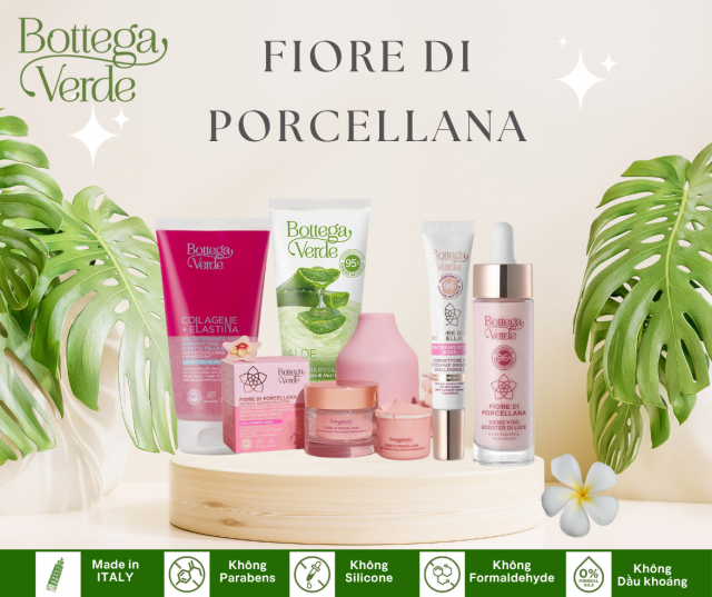 Thương hiệu và Bảo hànhThương hiệu: Bottega VerdeMã sản phẩm: Set Fiore di Porcellana GlowNơi sản xuất: ÝThời gian bảo hành: 24 tháng (tùy theo nhà phân phối).Thông tin sản phẩmSet dưỡng sáng da hoa sứ trắng FIORE DI PORCELLANA - BOTTEGA VERDE Ý là “bí kíp da sứ Ý” full 5 bước – biến làn da xỉn, nám, thô ráp thành trắng hồng, mịn màng như sứ chỉ sau 10 ngày. Gồm kem dưỡng, serum, kem mắt, tẩy tế bào chết, sữa rửa mặt – 96% tự nhiên, hoa sứ hữu cơ + Arbutin sinh học – phù hợp mọi loại da, mang lại làn da “phát sáng” tự nhiên, không cần filter, từ sáng họp hành đến tối tiệc tùng.Thiết kế: Hộp quà ngọc trai sang trọng, 5 sản phẩm mini size dễ thử full routine.Chất liệu: Bao bì tái chế 100%, kết cấu mịn phấn, tan nhẹ trên da.Thành phần set: 5 món (kem dưỡng 20ml, serum 10ml, kem mắt 5ml, tẩy tế bào chết 30ml, sữa rửa mặt 50ml).Tính năng Nổi bậtTrắng sáng “da sứ” +2 tone: Hoa sứ hữu cơ Ý + Arbutin ức chế melanin 80%, sáng da +2 tone tự nhiên sau 10 ngày (thử nghiệm lâm sàng).Làm sạch & tái tạo: Sữa rửa mặt + tẩy tế bào chết loại bỏ 99% tế bào chết, thu nhỏ lỗ chân lông 40%, da mịn như lụa.Nâng cơ & mờ nám: Serum + kem dưỡng/kem mắt tăng đàn hồi +82%, giảm nám, quầng thâm -70% sau 14 ngày.Dưỡng ẩm 24h không nặng: Bơ Karité + Hyaluronic Acid 3 trọng lượng cấp ẩm gấp 5 lần, da căng mọng, không bí.Dễ sử dụng: 5 bước chỉ 3 phút sáng/tối – sạch → tẩy → serum → mắt → dưỡng → làn da “porcelain glow” sẵn sàng.Công dụngDưỡng trắng toàn diện: Mờ nám, tàn nhang, thâm mụn – da sáng đều, hồng hào tự nhiên.Làm mịn & se khít: Thu nhỏ lỗ chân lông, giảm thô ráp – lý tưởng mọi da từ 25+.Routine “glow filter”: Lớp nền tự nhiên, makeup bám lâu 12h, da luôn “phát sáng” dù ánh đèn flash.Thông số Kỹ thuậtThương hiệu: Bottega VerdeModel: Set Fiore di Porcellana Glow (5 món)Tổng dung tích: 115mlThành phần chính: Hoa sứ hữu cơ Ý, Arbutin sinh học, bơ Karité, Hyaluronic Acid 3 trọng lượng, chiết xuất hạt nho, 96% tự nhiênLoại da phù hợp: Mọi loại daKết cấu: Mịn phấn, tan nhẹHiệu quả nổi bật: Sáng +2 tone sau 10 ngày, lỗ chân lông -40%, đàn hồi +82%Kích thước hộp (D x R x C): (180 x 140 x 60) mmXuất xứ: ÝLưu ý: Sản phẩm được giao ngẫu nhiên, không hỗ trợ chọn màu hoặc phân loại cụ thể